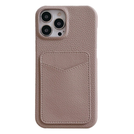 iPhone 15 Pro Litchi Leather Covered Plastic Case with Card Holder - Beige