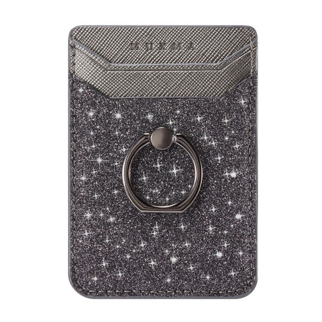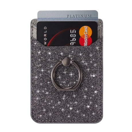 Leather Card Holder Stick-on w. Finger Ring - Glitter - Black