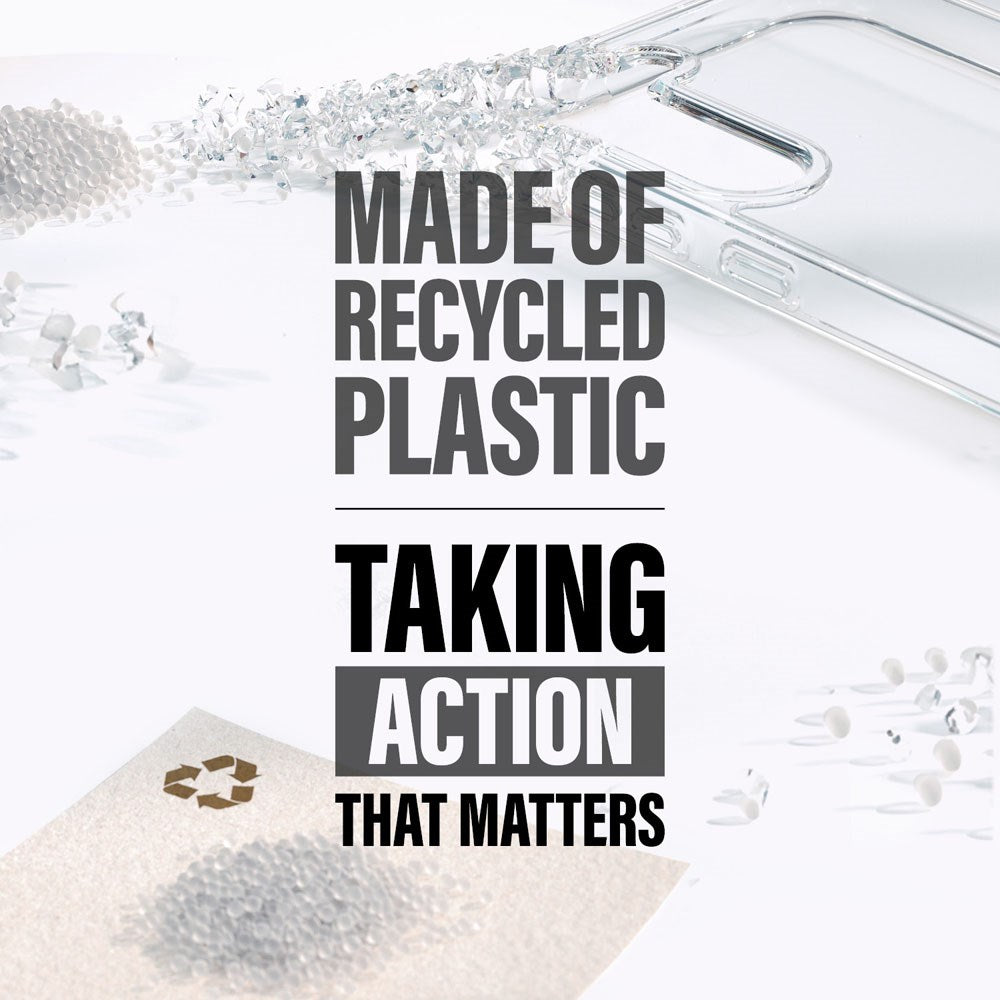 The case for iPhone 16 Pro is made from recycled plastic and has openings for the speaker, camera, and flash, as well as allowing for charging while the case is on.