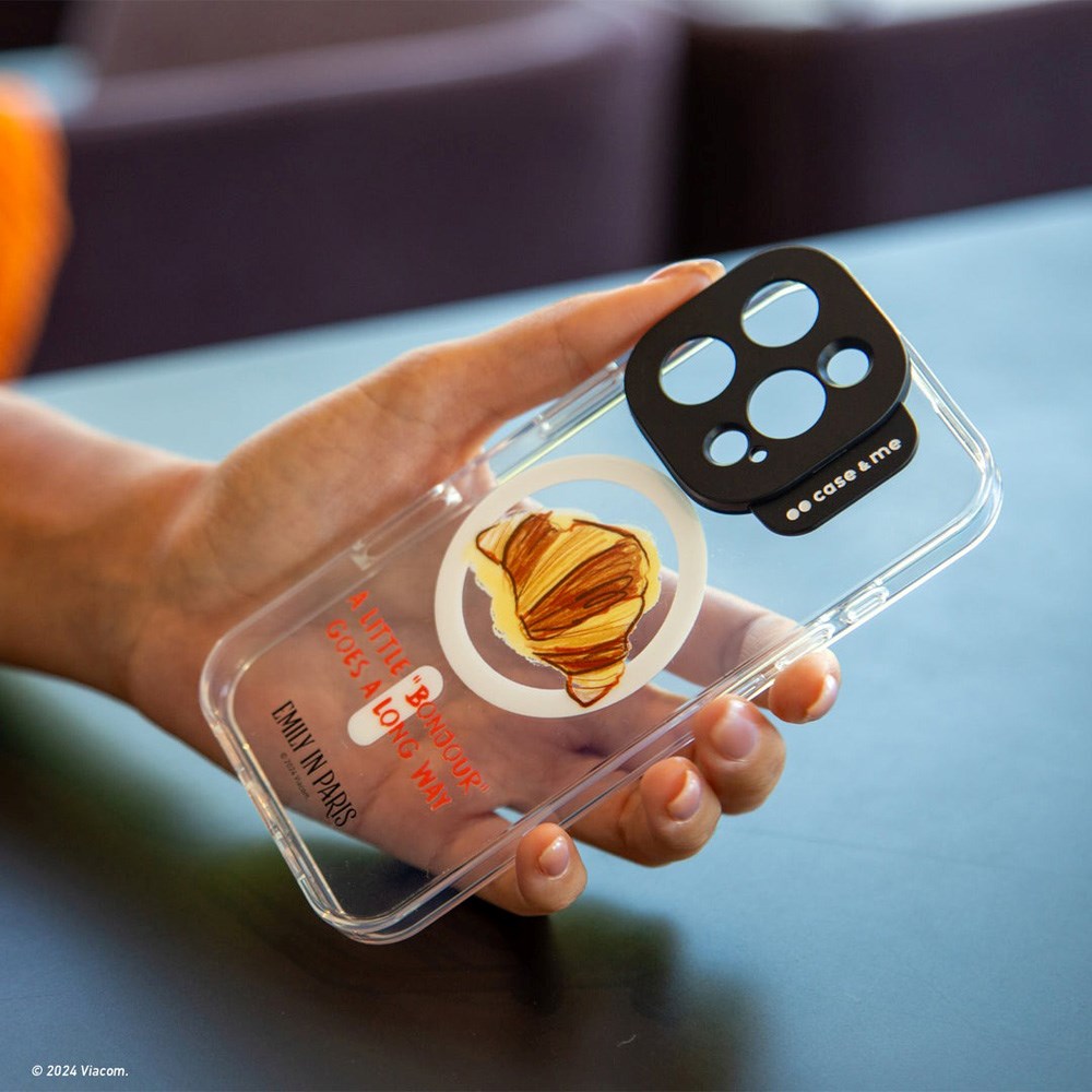 The Case&Me case is transparent and designed with a colored MagSafe module. Additionally, the case is also designed with two motifs – at the top, a croissant, and at the bottom, the quote "A little 'Bonjour' goes a long way", both of which create a connection to the series' universe.