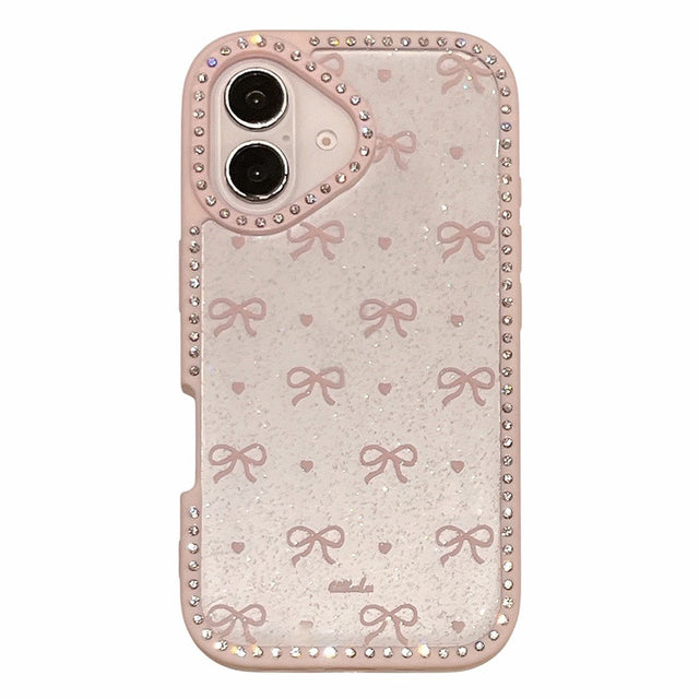 iPhone 16 Hybrid Case with Bows and Rhinestones - Transparent / Pink