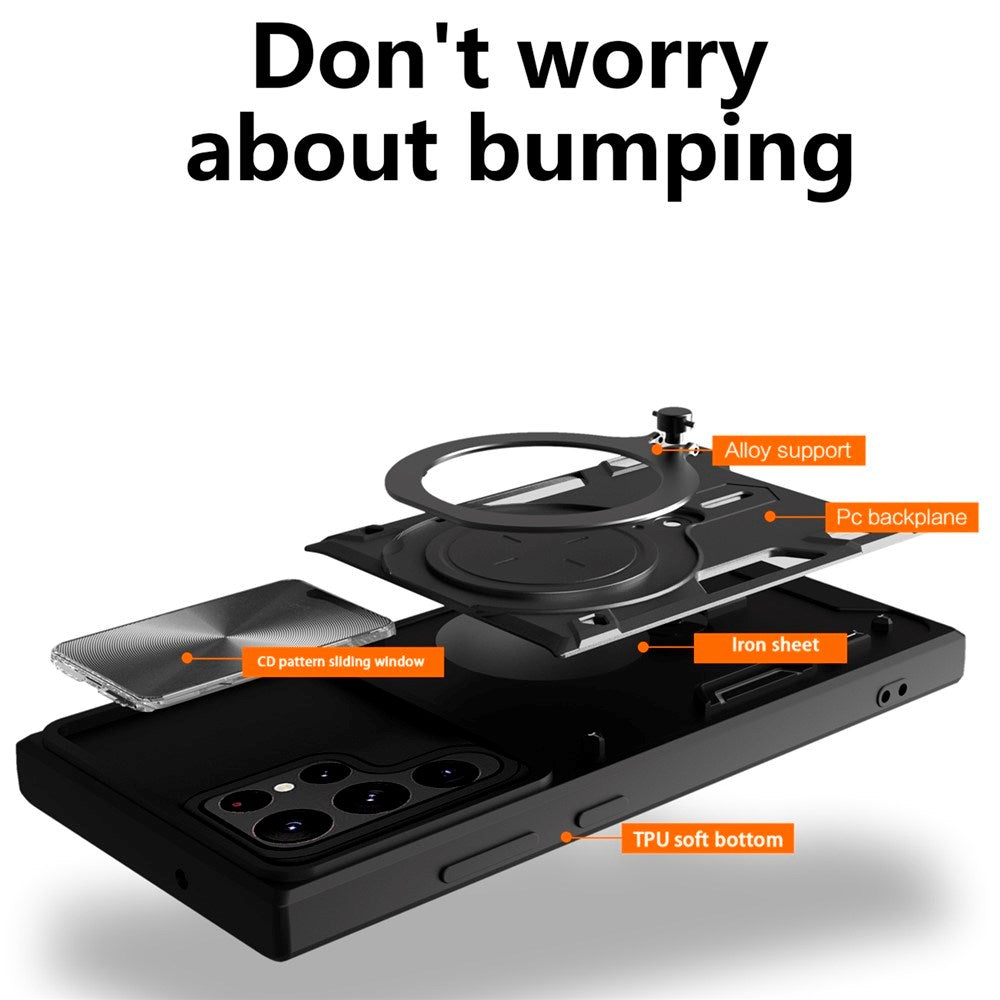 The built-in camera slider protects the lens from dust and scratches, while the 360-degree rotating kickstand allows for convenient hands-free viewing in both horizontal and vertical positions.