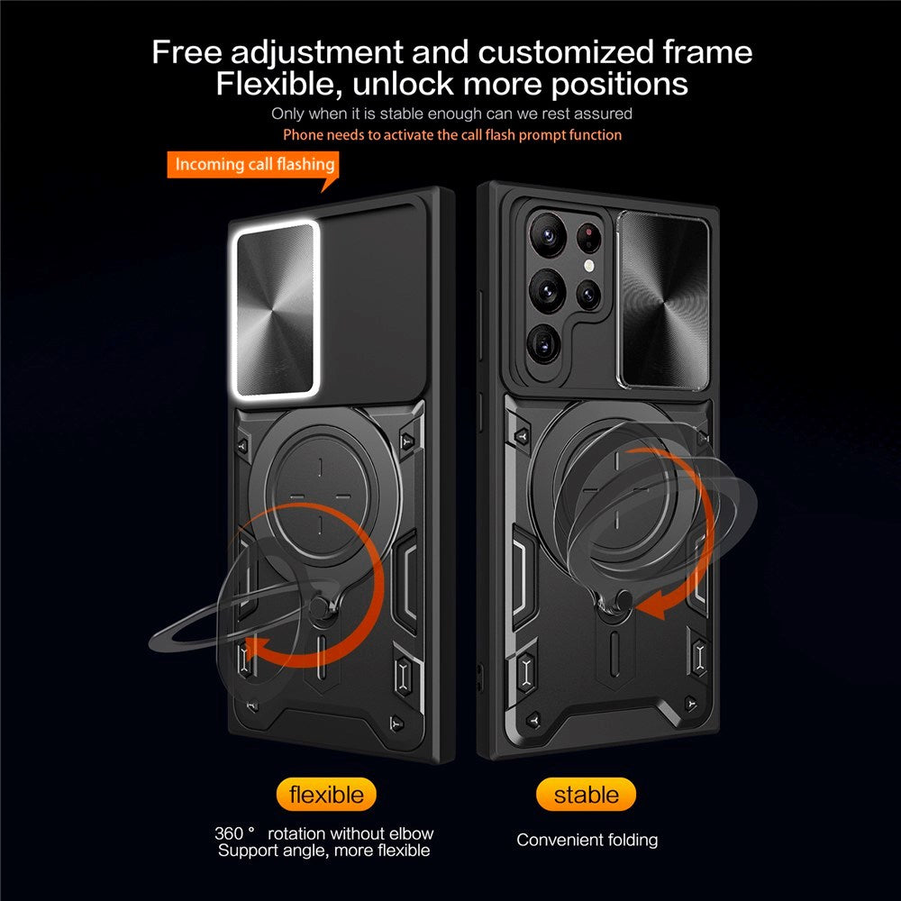 The built-in camera slider protects the lens from dust and scratches, while the 360-degree rotating kickstand allows for convenient hands-free viewing in both horizontal and vertical positions.