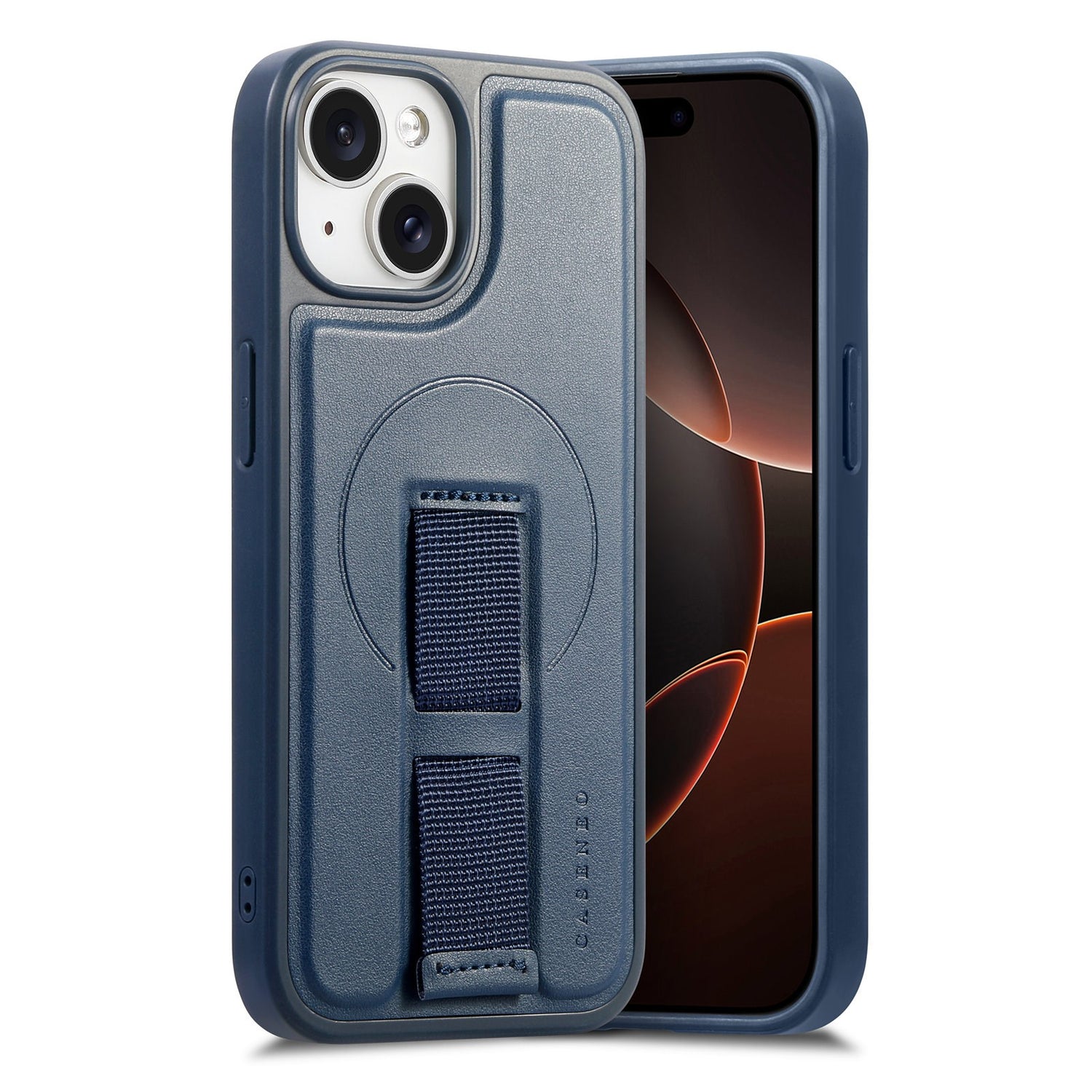 iPhone 14 / 13 Hard Plastic Case with Faux Leather Back & Finger Strap - MagSafe Compatible - Blue ist auf Lager und wird versandt, sobald es wieder verfügbar ist
