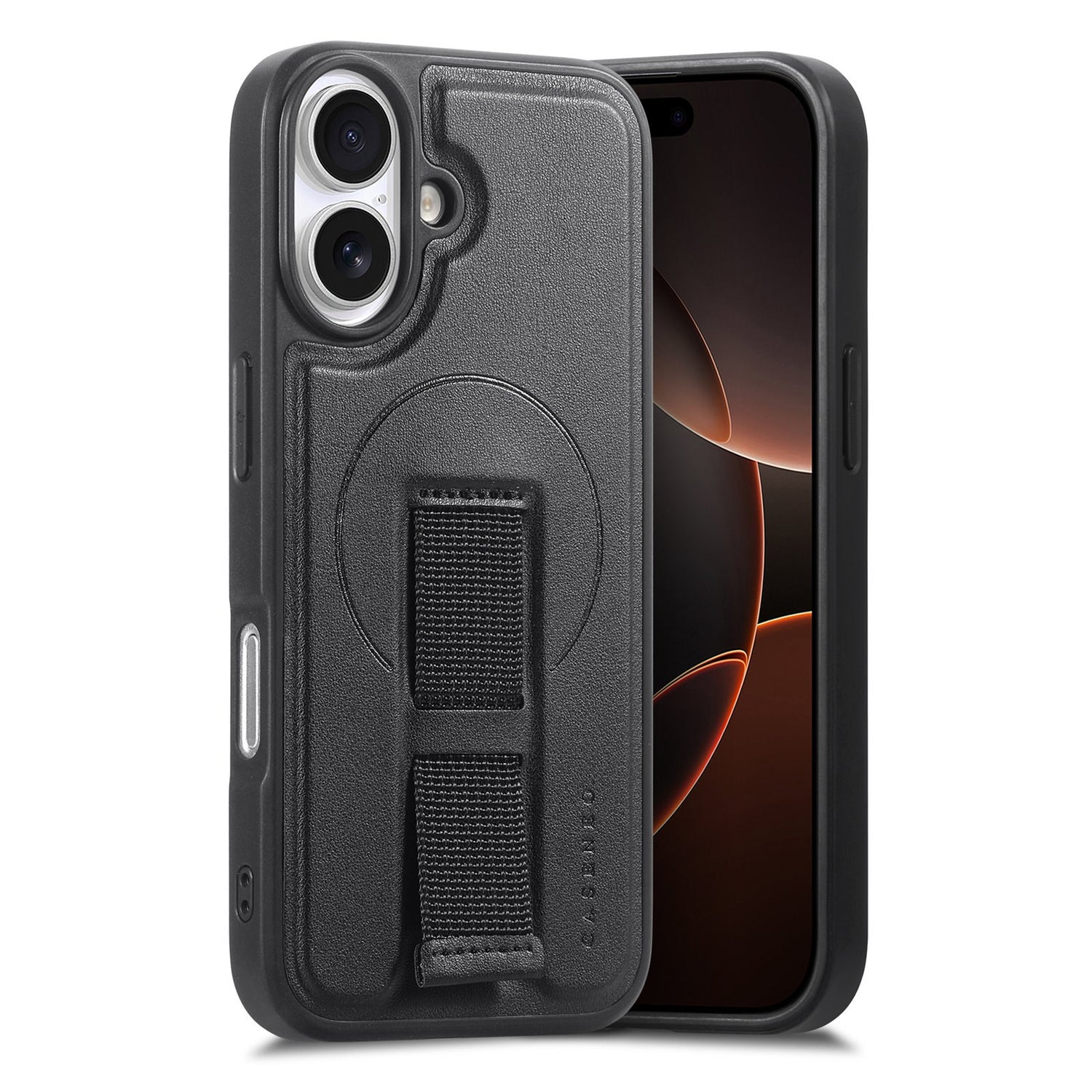 iPhone 16 Hard Plastic Case with Faux Leather Back & Finger Strap - MagSafe Compatible - Black