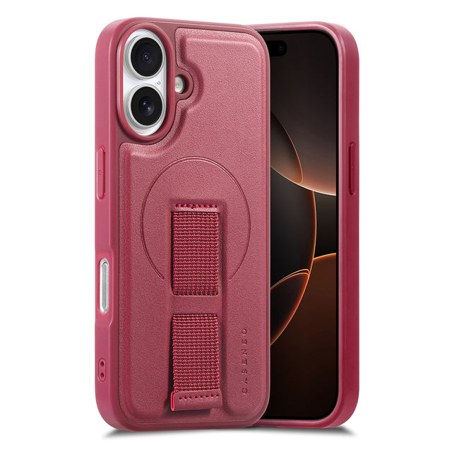 iPhone 16 Hard Plastic Case with Faux Leather Back & Finger Strap - MagSafe Compatible - Red
