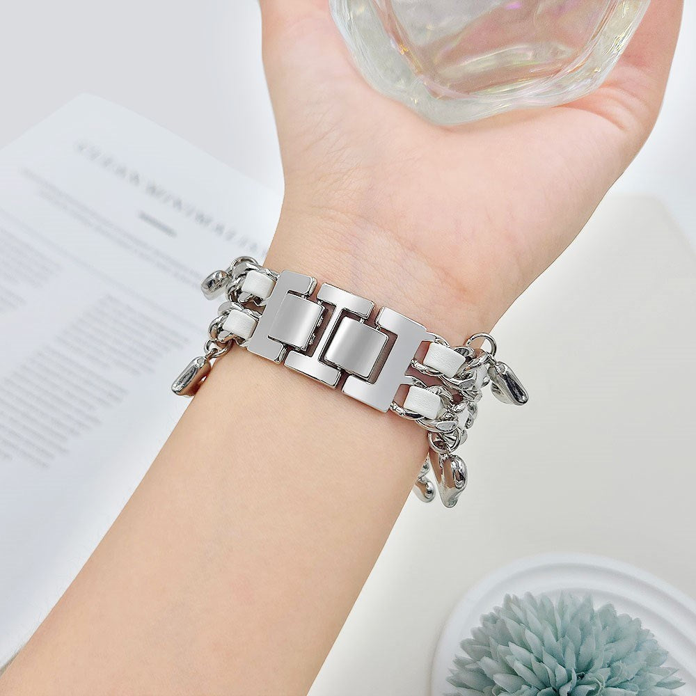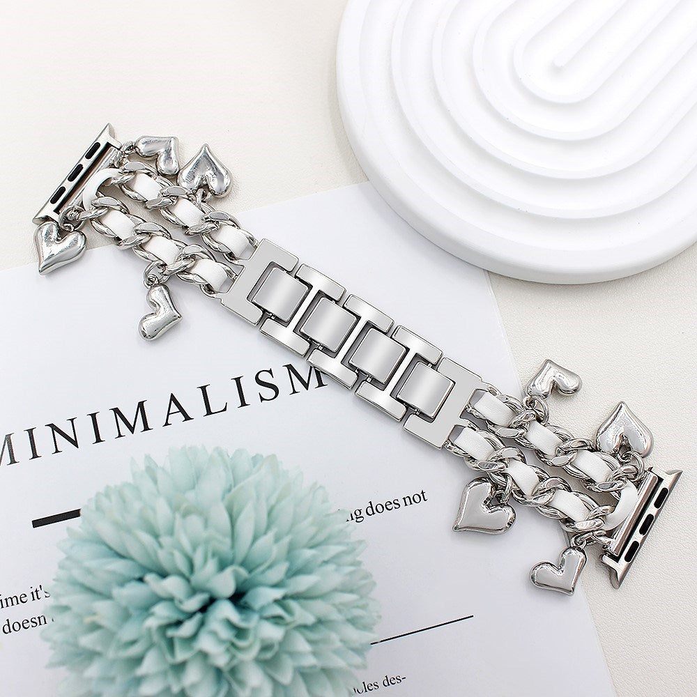 Apple Watch (42 / 44 / SE / 45 / 46 / 49mm) Metal Strap with Vegan Leather & Pendant - Silver / White