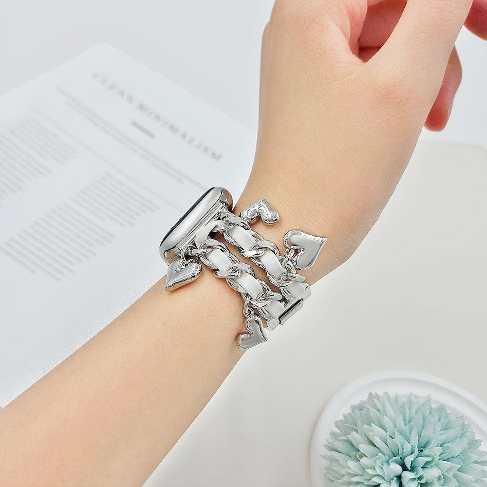 Add a touch of elegance and romance to your wrist with EIDERWOOD's Metal Strap for Apple Watch (42 / 44 / SE / 45 / 46 / 49mm). This strap combines a stylish mix of metal and vegan leather in a twisted chain design, making it a striking accessory that catches attention. Designed with beautiful butterfly and flower pendants, it adds both charm and femininity to your look.
