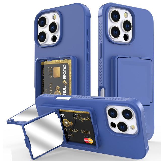 iPhone 16 Pro Max Flexible Plastic Case with Card Holder & Built-in Mirror - Blue
