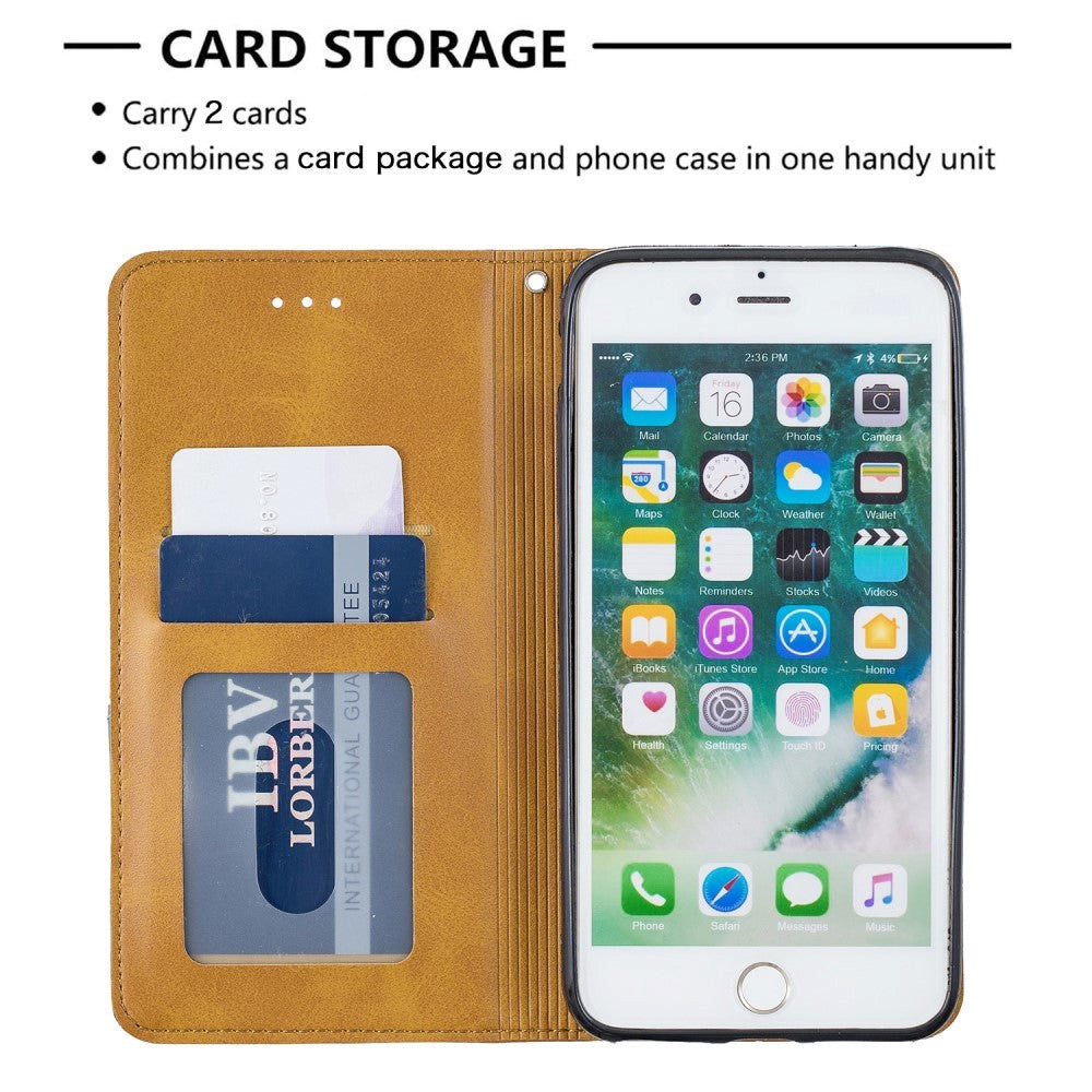 A smart flip case for iPhone 8 Plus / 7 Plus. The surface on both the inside and outside of the case is made of imitation leather, which is soft and has a stylish look. The case has a built-in purse with space for cards and banknotes, and at the same time provides a 360 degree protection.