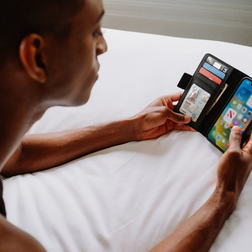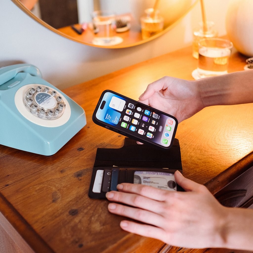 Inside, the left side has space for four credit cards and a large pocket for banknotes, receipts or similar. One pocket has a transparent panel, which can also be used for photos. in the Right side there is a case for iPhone 14. The case is made of hard plastic, which is lined with a nice fabric material on the inside. The case is attached with a magnet, so it is possible to remove the back case from the flip case if you do not want to carry the whole case.