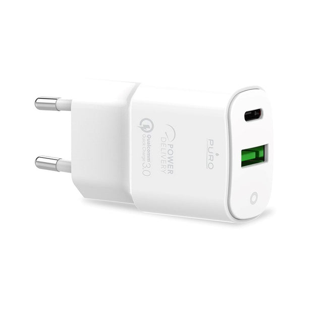 With this 20W Mini Travel Wall Charger with USB-C and USB-A from Puro, you can charge both your phone, your tablet or maybe your headphones. Using Power Delivery (PD), you can quickly and efficiently charge your various devices so that you can use them again.