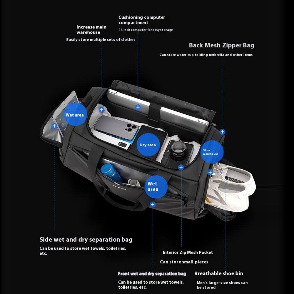 - Special Features: Anti-theft zipper design, Wet and dry separation compartment, Independent shoe compartment