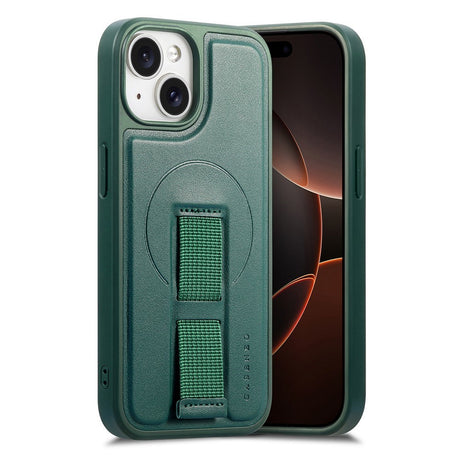 iPhone 15 Hard Plastic Case with Faux Leather Back & Finger Strap - MagSafe Compatible - Green
