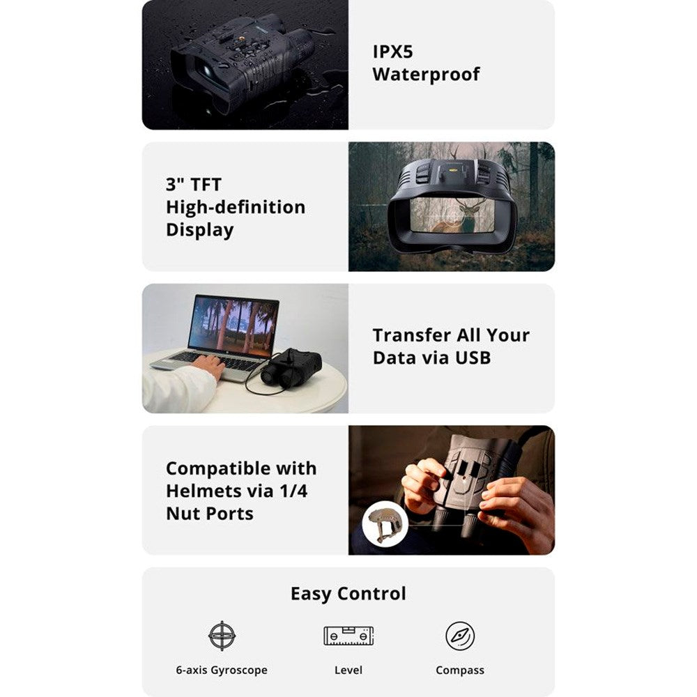 Despite its advanced features, this night vision binocular is lightweight and portable, weighing under 500 grams, making it easy to carry in a bag or attach to a helmet, tripod, or strap. The robust IPX5 waterproof design ensures reliable use in all weather conditions.
