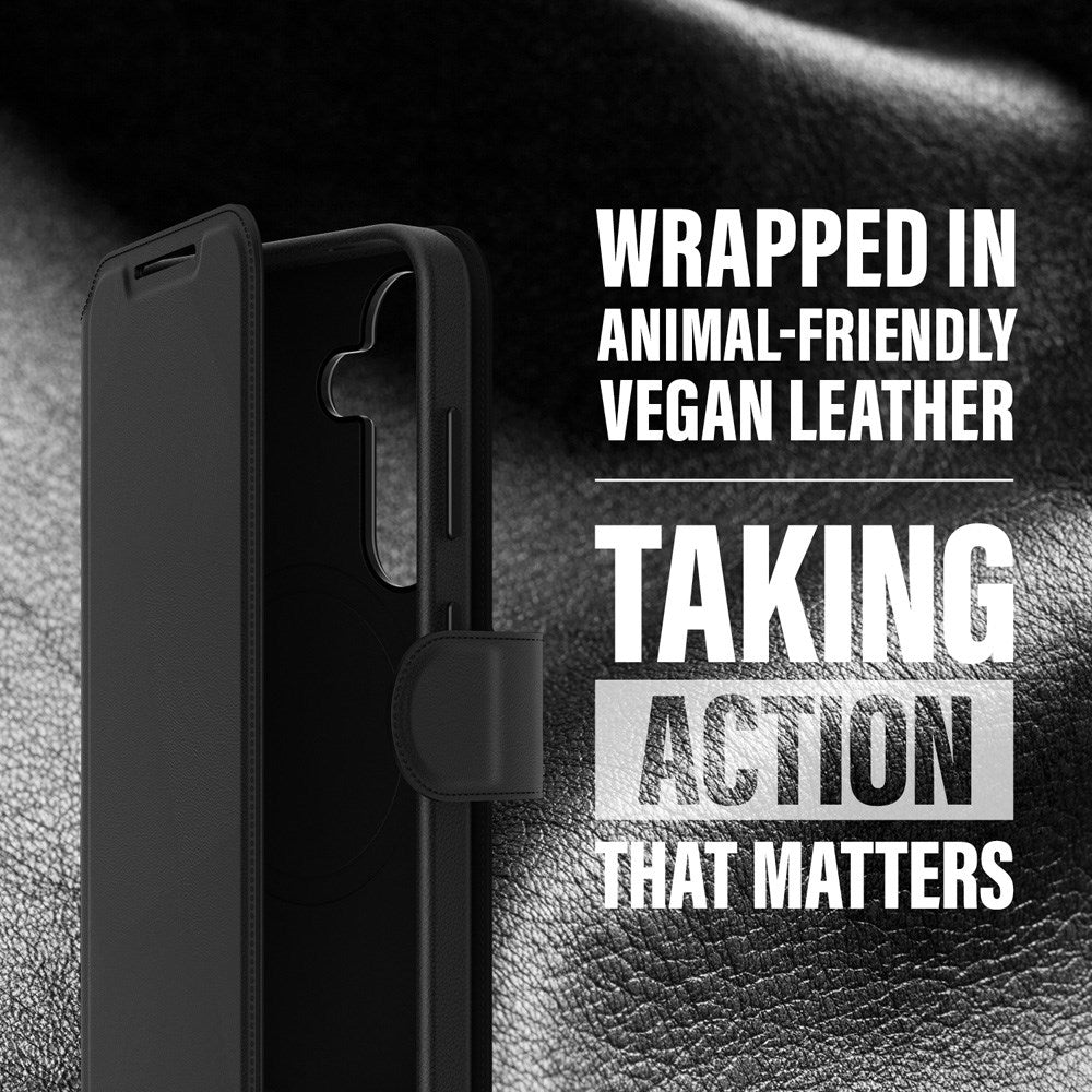 The Samsung Galaxy S25 case is made of vegan leather (the flip case) and recycled plastic (the back case), which ensures a nice surface and good durability.
