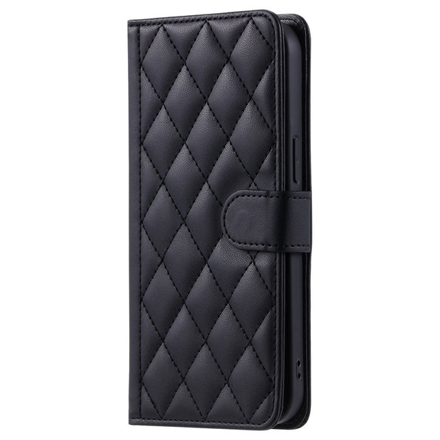iPhone 16 Pro Max Leather Flip Case w. Wallet & Strap - Rhombus - Black