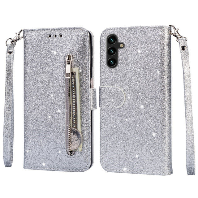 Samsung Galaxy S25 Glitter Flip Case with Zipper Pocket & Stand Function - Silver