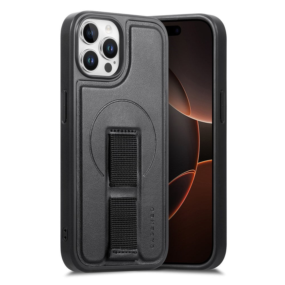 iPhone 12 / 12 Pro Hard Plastic Case with Faux Leather Back & Finger Strap - MagSafe Compatible - Black