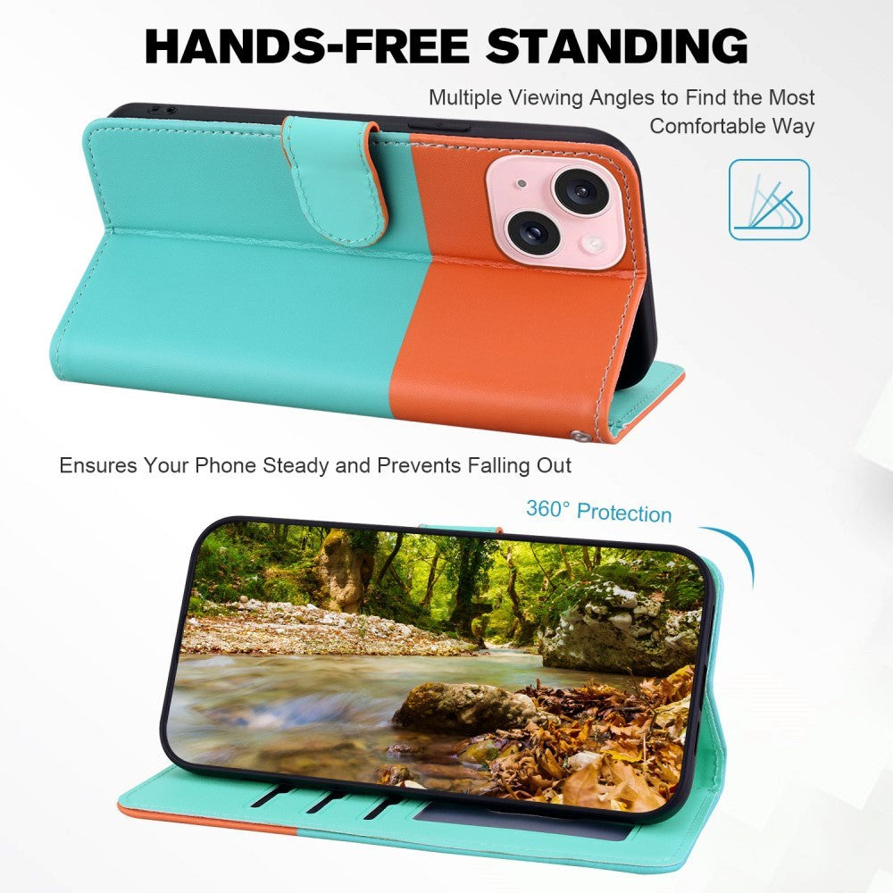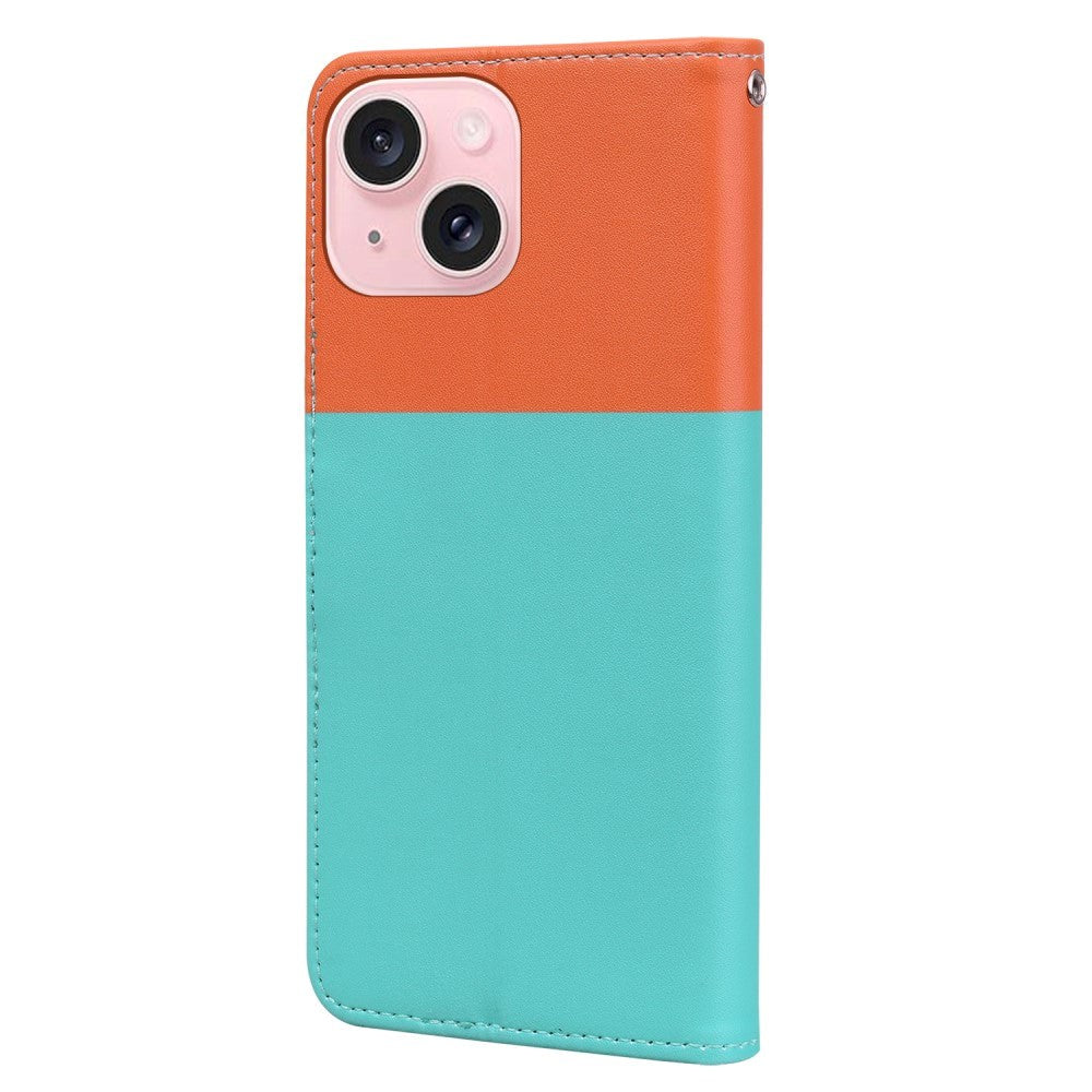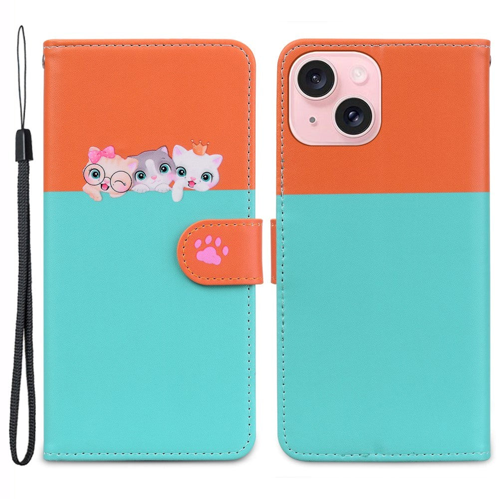 iPhone 15 Flip Case with Strap / Standing function / Card Holder - Orange / Blue (Cats)