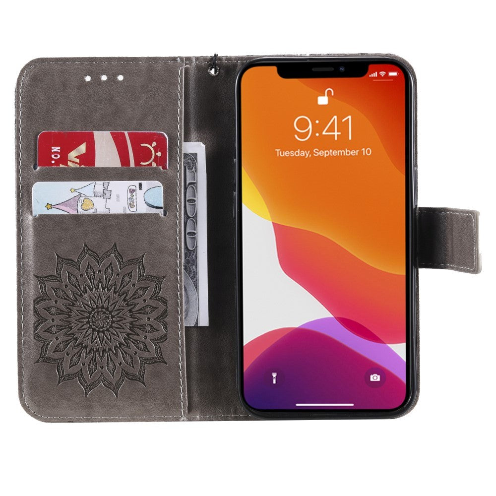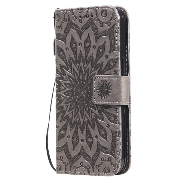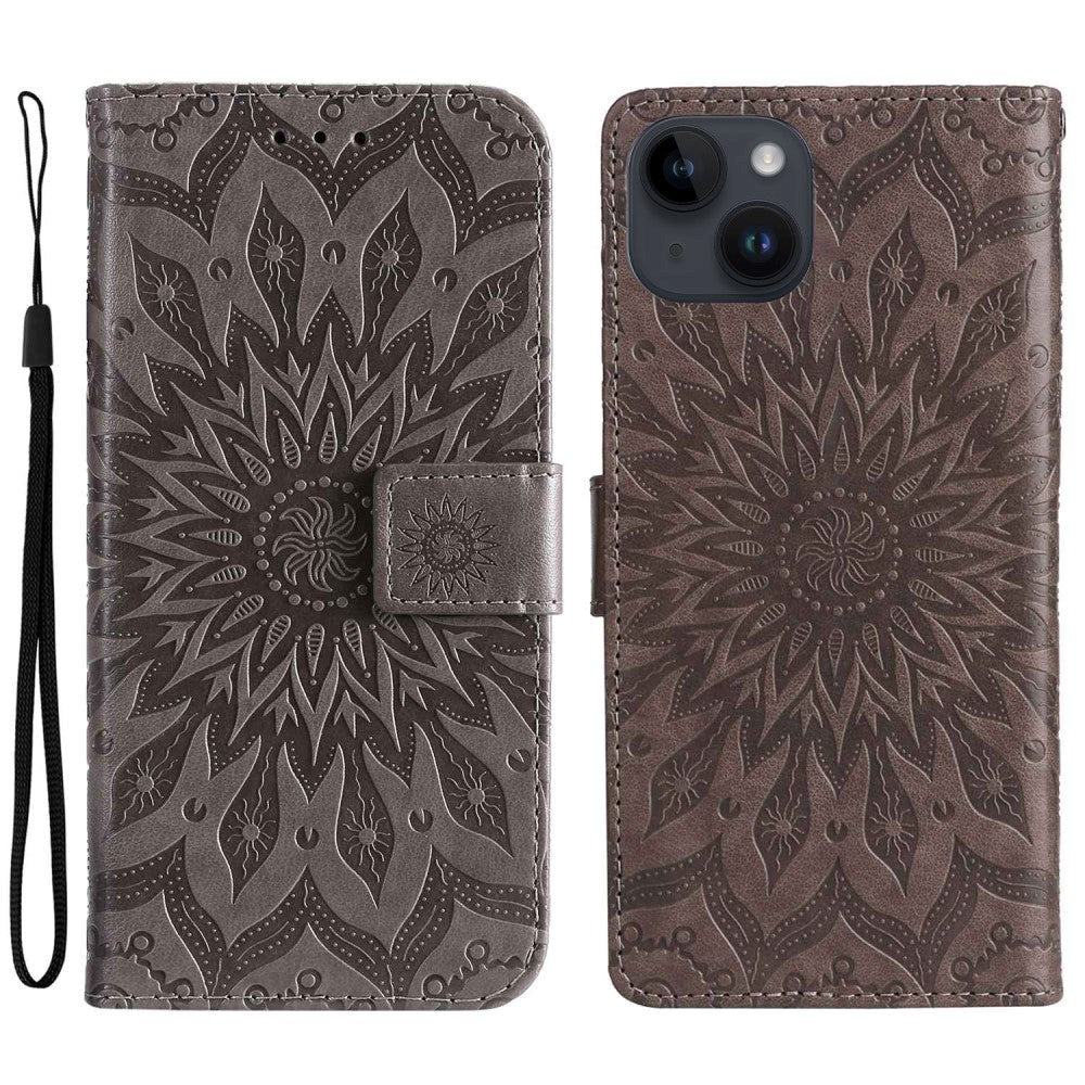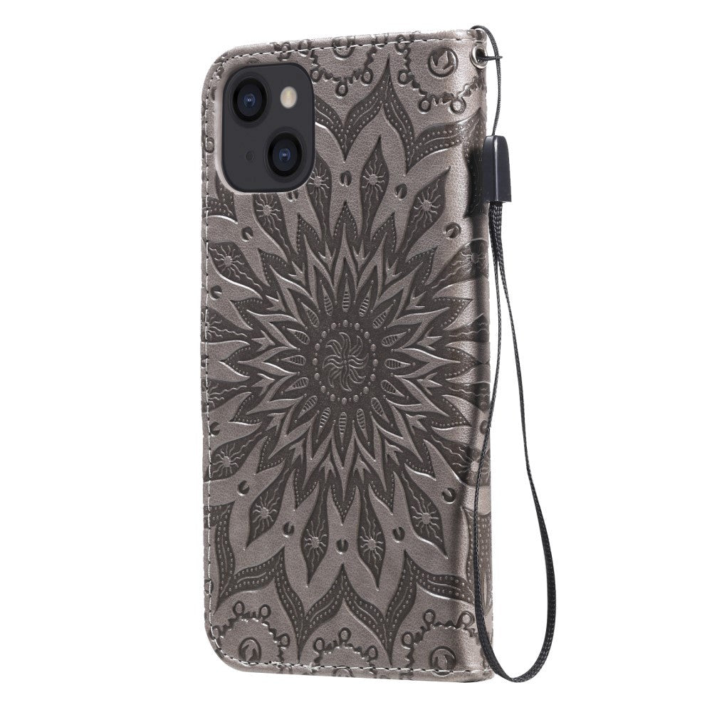 iPhone 15 Leather Case with Wallet and Strap - Mandala Flower - Brown