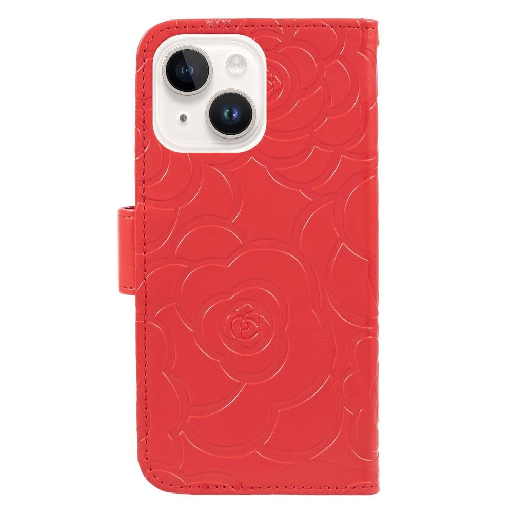 iPhone 15 Plus Artificial Leather Case w. Wallet og Strap - Camellia Flower - Red