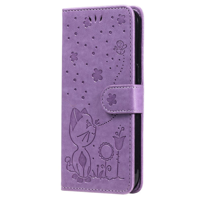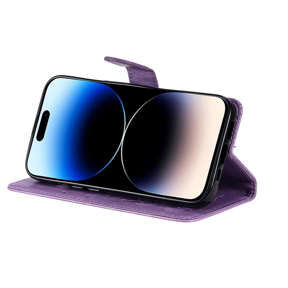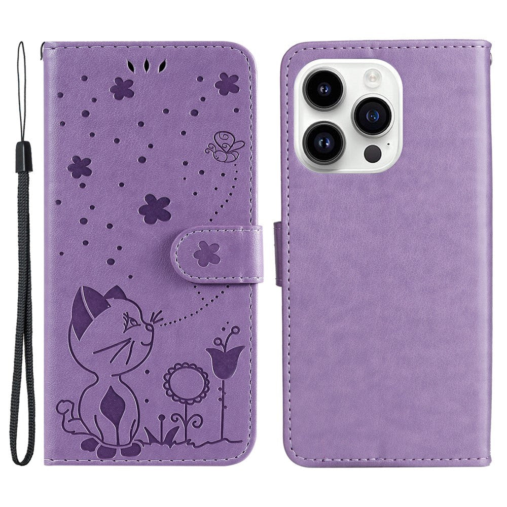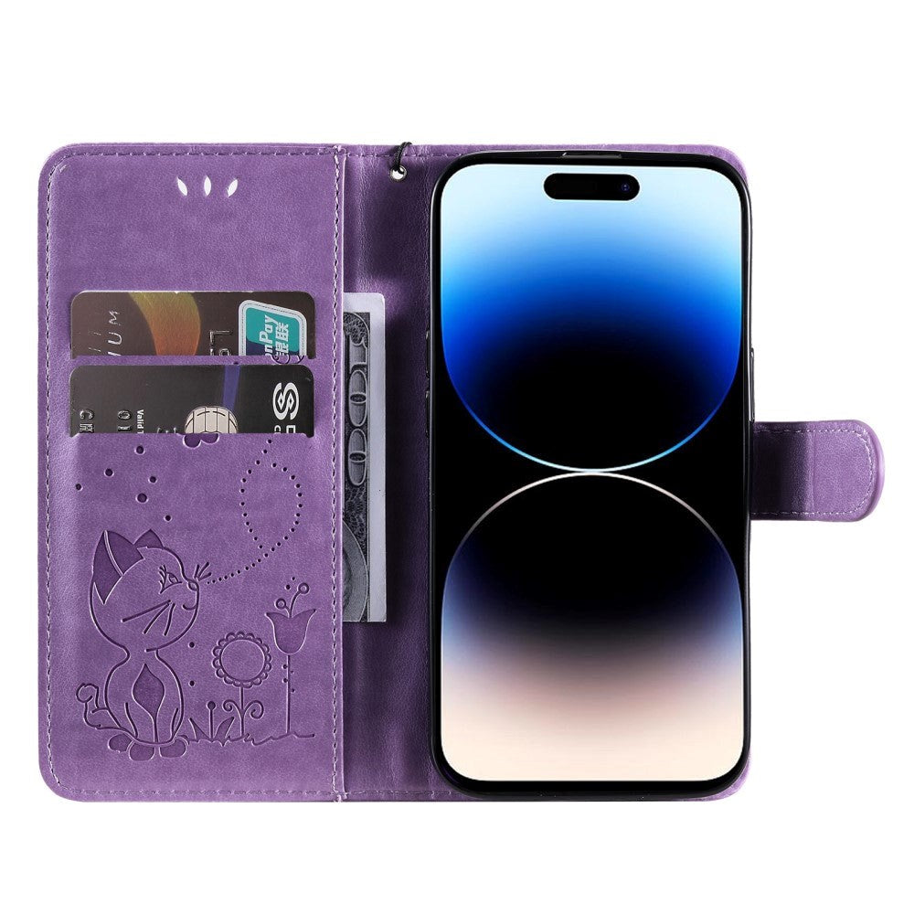 iPhone 15 Pro Leather Flip Case with Wallet and Strap - Cat Engraving - Purple