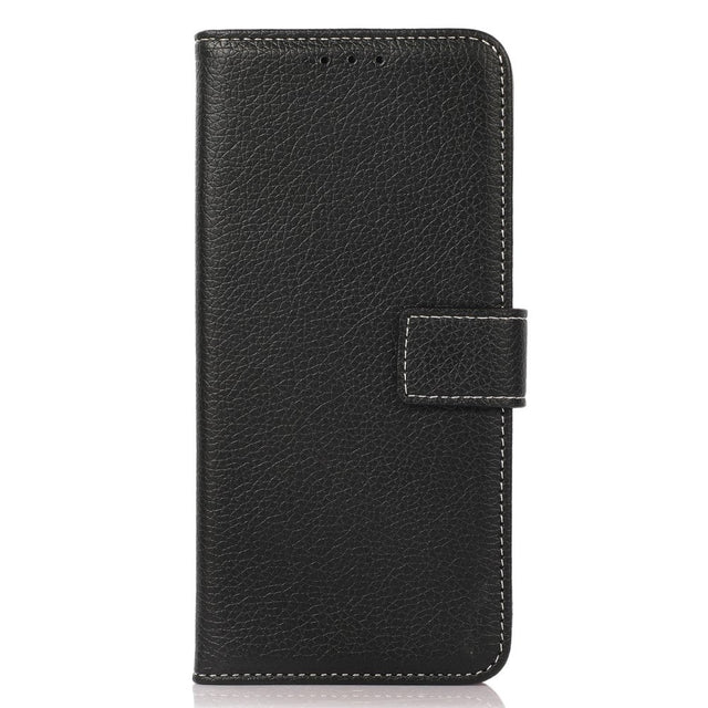 iPhone 15 Pro Litchi Leather Flip Cover w. White Stitches and Wallet - Black