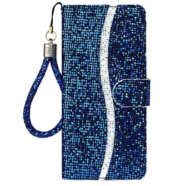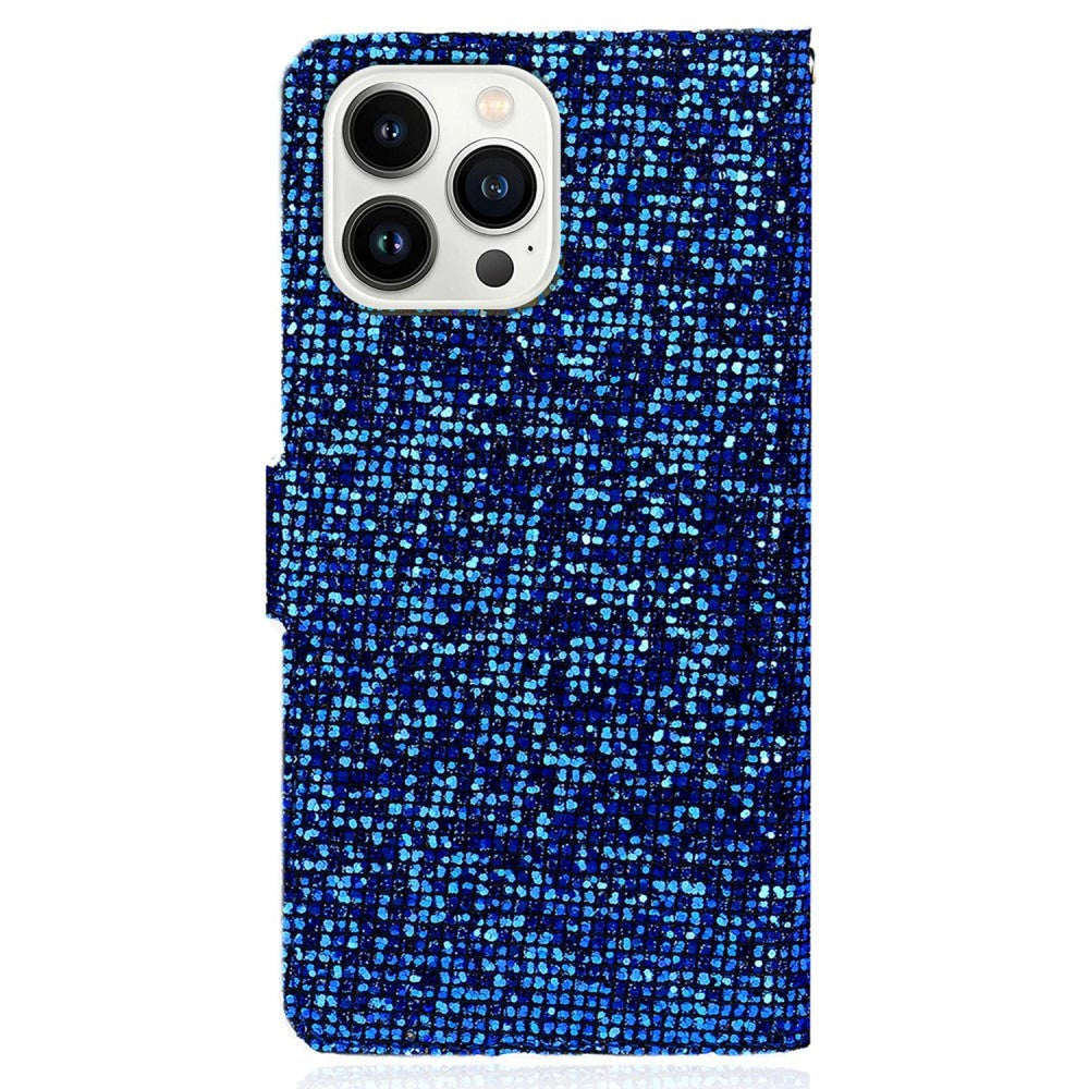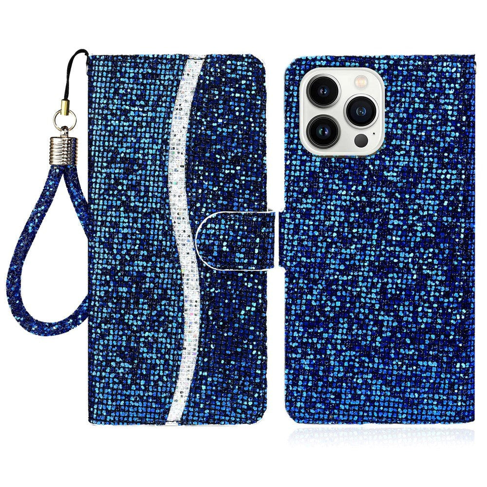 iPhone 15 Pro PU Leather Flip Case with Wallet & Strap - Glitter Design - Blue