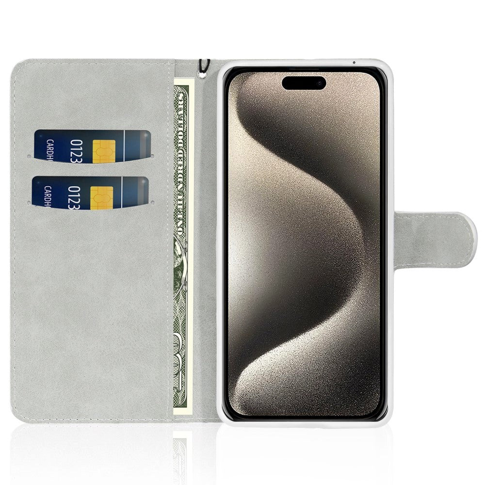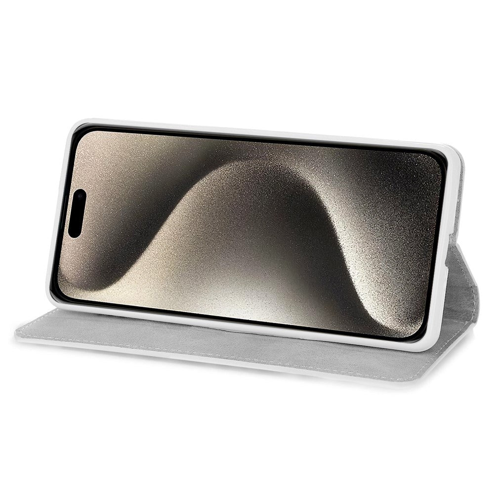 This iPhone 15 Pro flip case closes with a small leather flap with a magnet. When the case is opened, there is a TPU plastic cover on the right side, which the mobile phone is securely attached to. On the opposite side, there are 2 openings for credit cards and a pocket for storing banknotes.