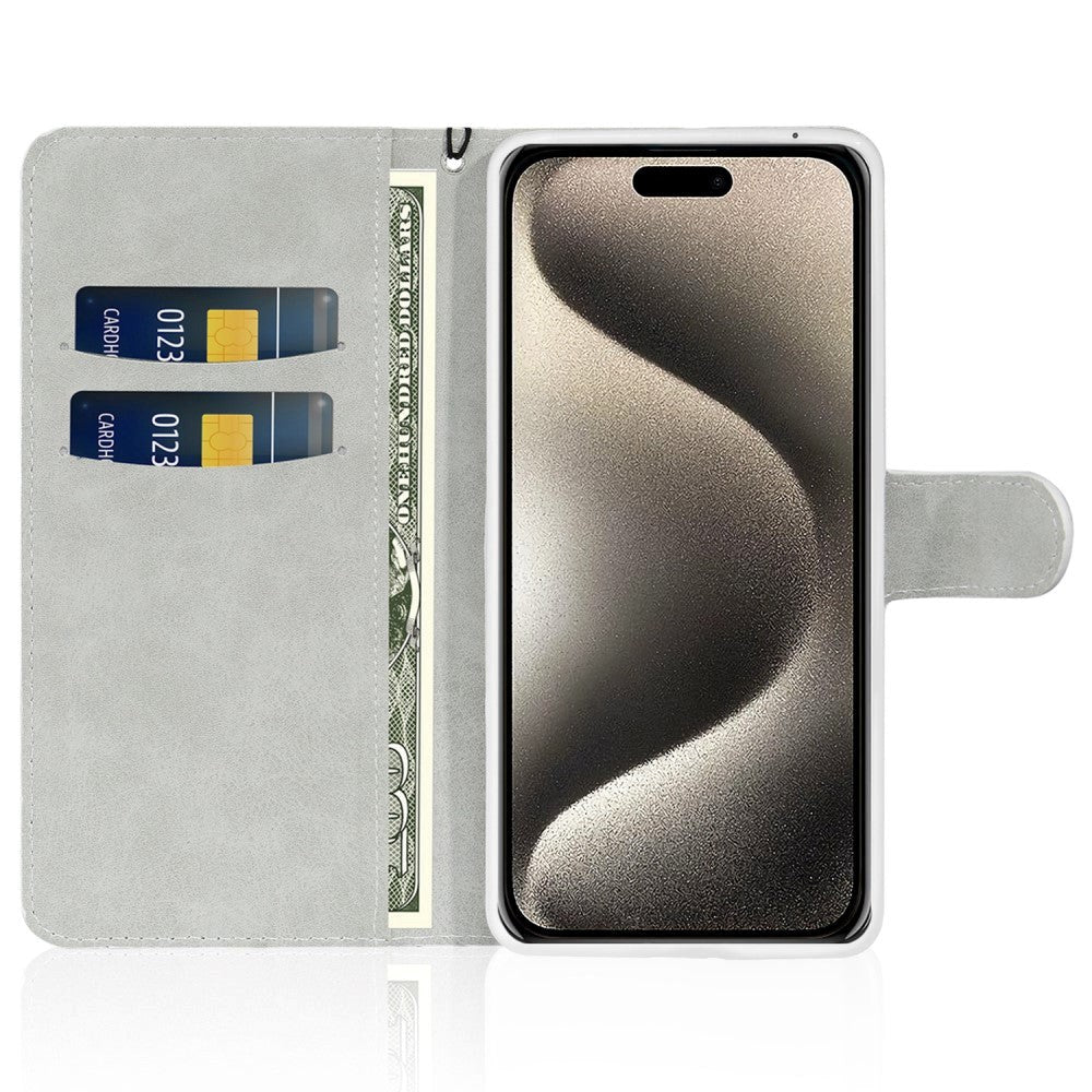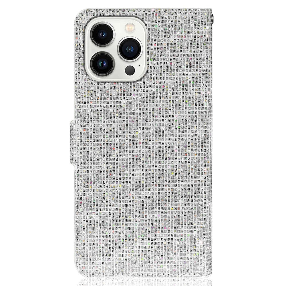 iPhone 15 Pro PU Leather Flip Case with Wallet & Strap - Glitter Design - Silver