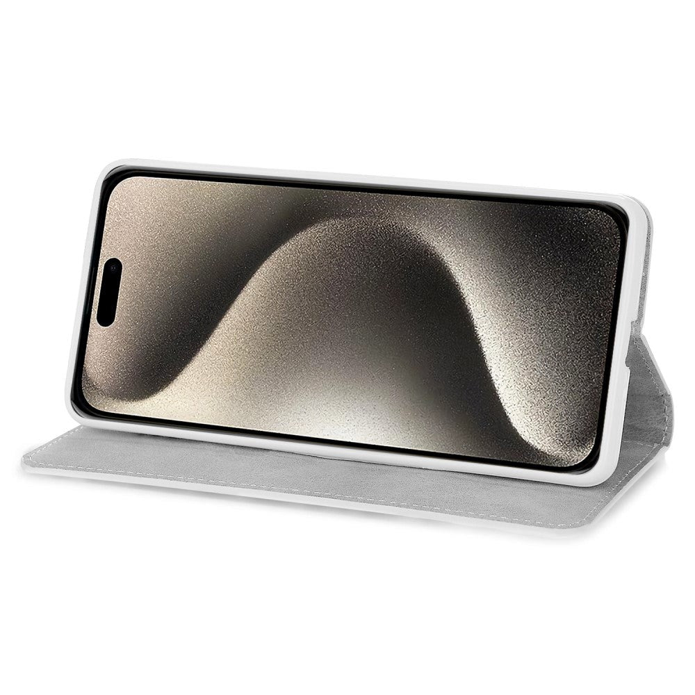 This iPhone 15 Pro flip case closes with a small leather flap with a magnet. When the case is opened, there is a TPU plastic cover on the right side, which the mobile phone is securely attached to. On the opposite side, there are 2 openings for credit cards and a pocket for storing banknotes.