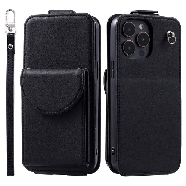 iPhone 15 Pro Vertical Faux Leather Flip Case with Wallet / Stand Function / Strap - Black