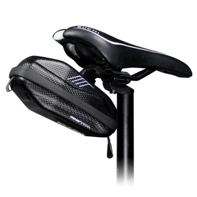 The holder is tightened around the seat bar using velcro straps. It's a hard case, so it keeps its shape and can take a few strokes if you should end up tipping over.
