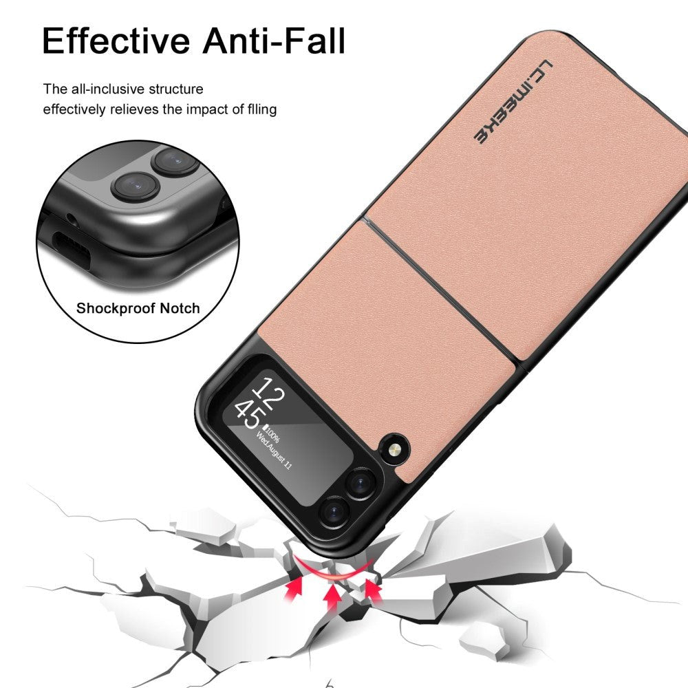 This Samsung Galaxy Z Flip4 (5G) case is made of a material of hard and shock-absorbing plastic, and on the back of the case it is covered with a layer of nice artificial leather. The leather covering makes the case very comfortable to hold.