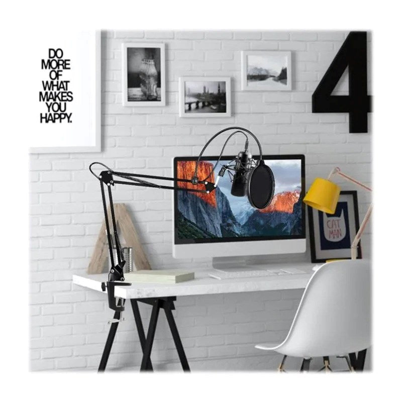 This kit includes everything you need to create a stable and functional recording setup. The adjustable metal boom arm can be easily mounted to a desk using the included clamp, giving you full flexibility to position the microphone optimally. A shock mount is also included to reduce vibrations from the desk, along with a pop filter and windscreen that minimize harsh consonant sounds and breath noise for cleaner audio.