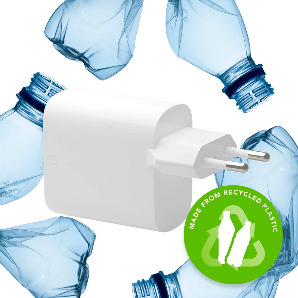 The wall charger is made from 100% GRS-certified recycled plastic and is fully recyclable. It is manufactured with GaN technology, which means it is smaller and more powerful than traditional wall chargers. The power supply is therefore more efficient, resulting in less heat waste and lower energy consumption - there’s no reason not to choose this wall charger from dbramante1928 if you care about the environment and want top-level quality and functionality.