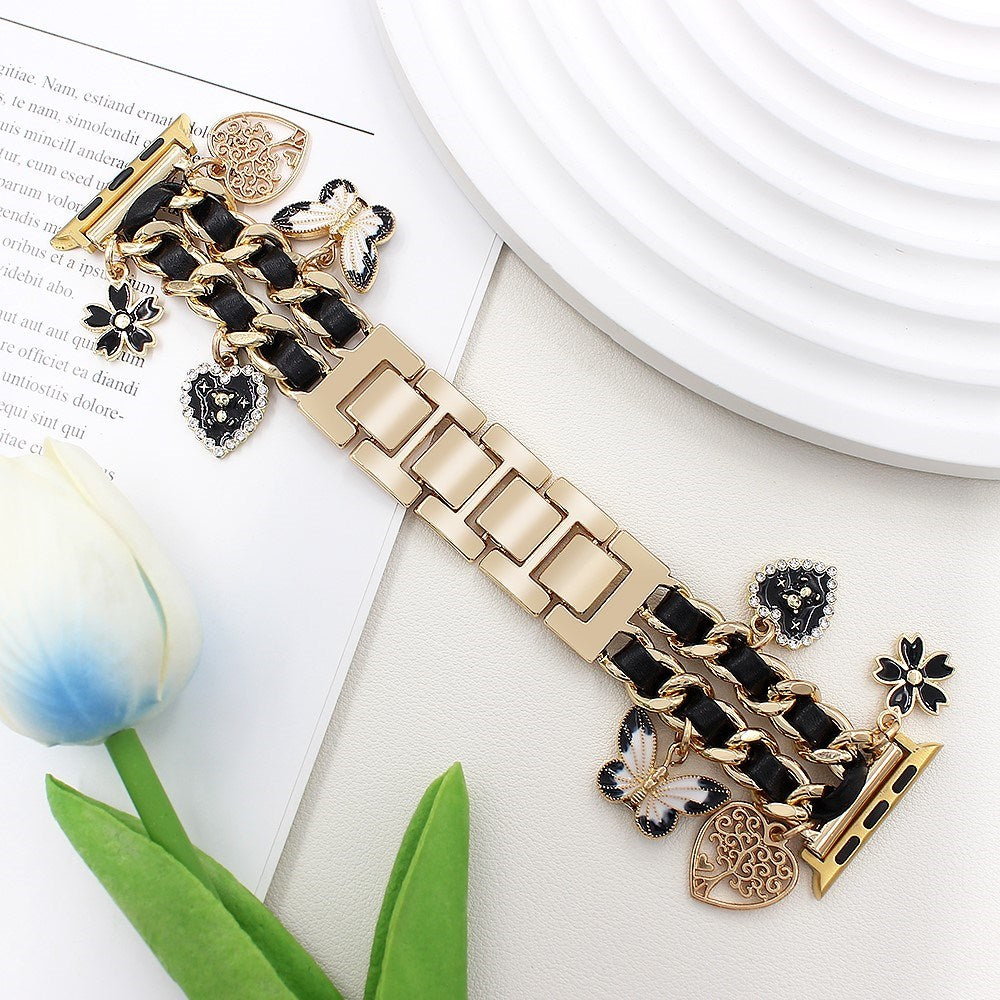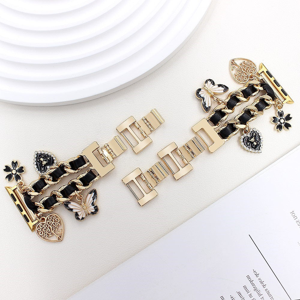Add a touch of elegance and romance to your wrist with EIDERWOOD's Metal Strap for Apple Watch (38 / 40 / SE / 41 / 42mm). This strap combines a stylish mix of metal and vegan leather in a twisted chain design, making it a striking accessory that catches attention. Designed with beautiful butterfly and flower pendants, it adds both charm and femininity to your look.