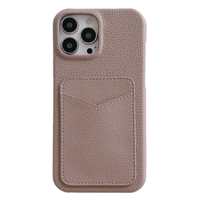 iPhone 15 Pro Litchi Leather Covered Plastic Case with Card Holder - Brown