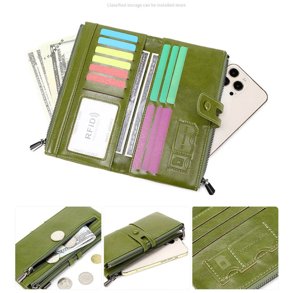 Pungen har 3 lynlåslommer og hele 13 kortlommer, hvoraf den ene er gennemsigtig, så du kan se indholdet. Derudover tilbyder den to større lommer til kontanter eller lignende, samt 2 lommer specifikt designet til SD-kort.