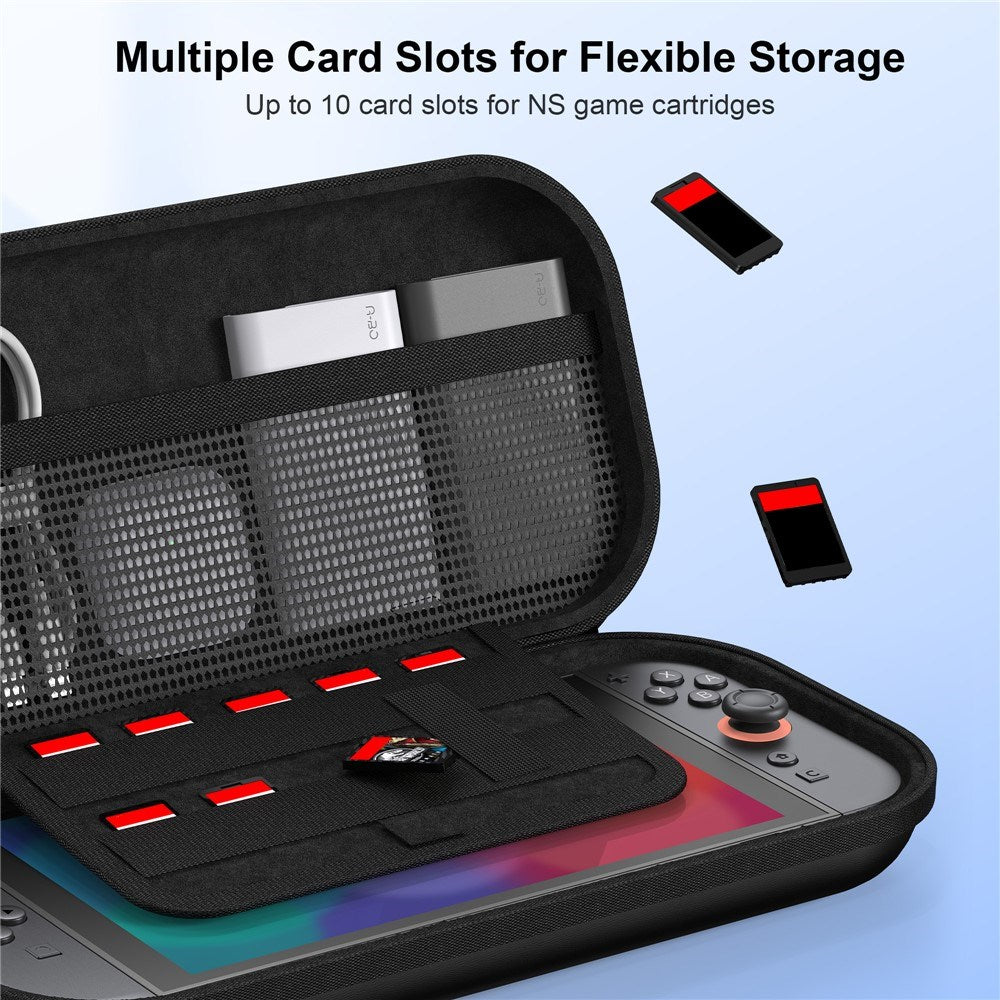 The exterior is designed as a hard shell, providing solid protection against bumps and impacts. Inside, the case features various compartments and storage options. In addition to your Nintendo Switch 2, you can also store cables, SD cards, and other accessories in this travel case.