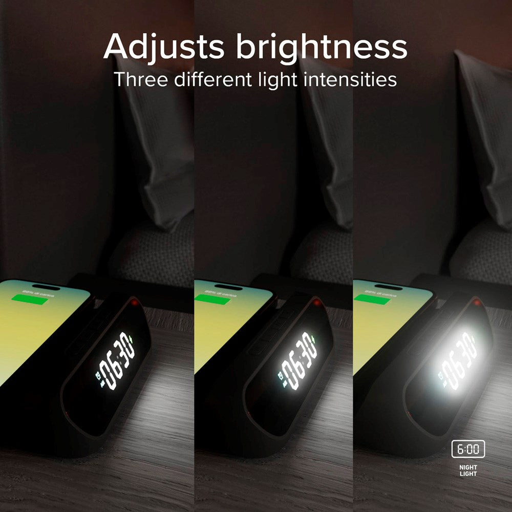 The alarm clock features a large digital display with three adjustable brightness levels so you can customize it to your preference without disrupting your sleep. Choose between 12- or 24-hour formats and enjoy the classic snooze function with 5-minute intervals for a gentle and relaxed awakening.